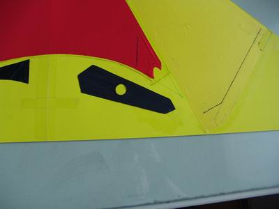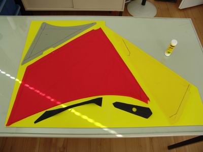 Und da ich schon dabei bin, nehme ich auch gleich die Verstärkungen vom Mittelkreuz und den Winglets und mache mir in gleicher Weise auch davon Schablonen. Das Dacron läßt sich mit Pattex jedoch deutlich besser verkleben!